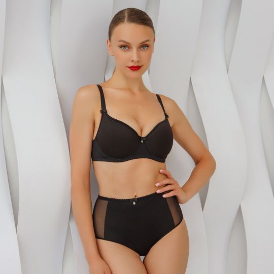 Чашки бюстгальтера имеют тройное горизонтальное членение и выполнены из комбинации двух полотен: верхняя деталь из кружевного полотна (пр-во Франция), нижняя деталь чашки из мягкой шелковистой микрофибры (пр-во Франция). Центральная деталь стана из кружевного полотна, до упругой боковой пластины дублирована сеткой, далее-микрофибра. Боковая упругая пластина обеспечит дополнительную поддержку, предотвратит деформацию и скручивание стана и сделает мягче переход от тонкого кружевного полотна к более плотной микрофибре.